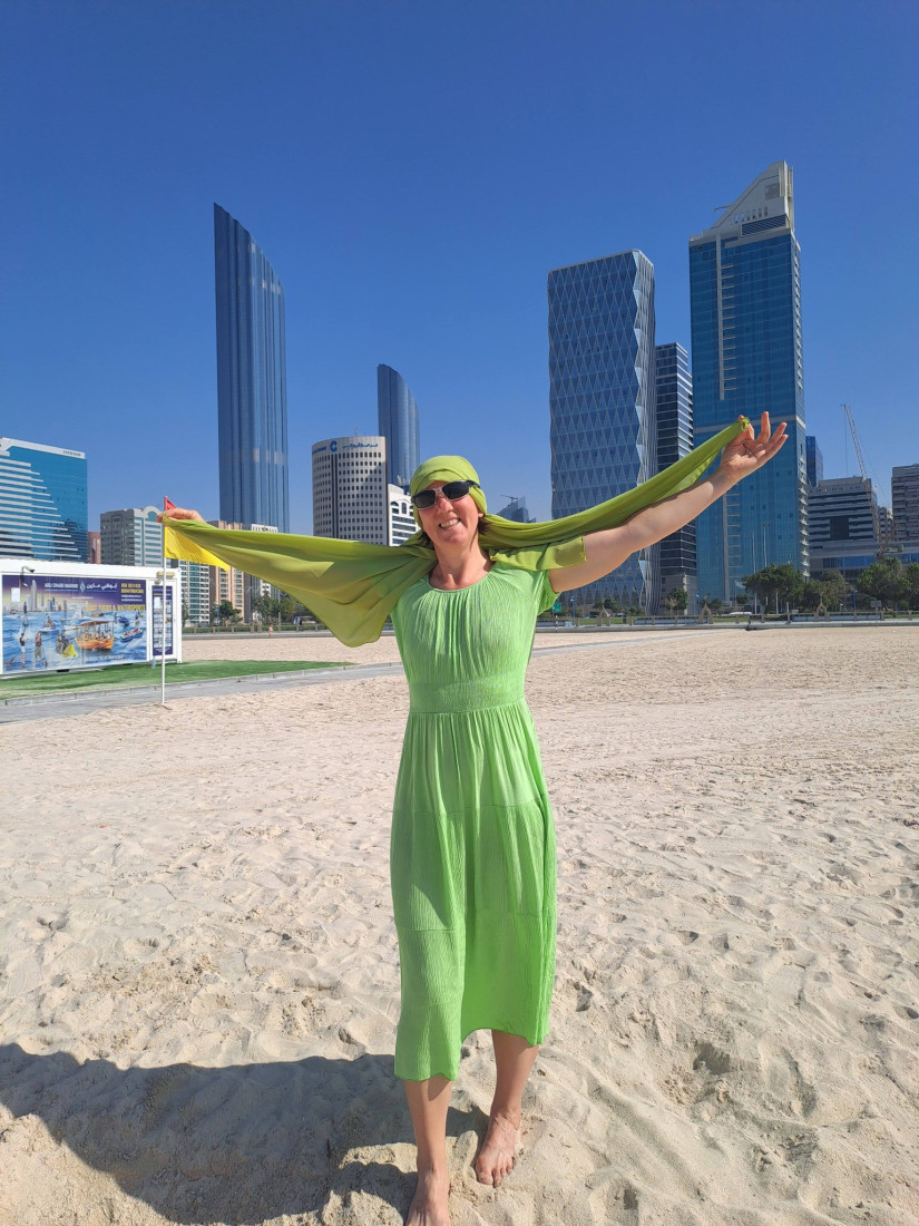 Abu Dhabi ir samērā klusa, ļoti sakopta pilsēta, vispār nav motorolleru jeb skūteru, ir ļoti maz velosipēdistu. Ir ļoti daudz mošeju starp augstceltnēm. Pa ielām staigā kaķi, kas nāk mīļoties. Un galvenais - ir svaigs gaiss.
