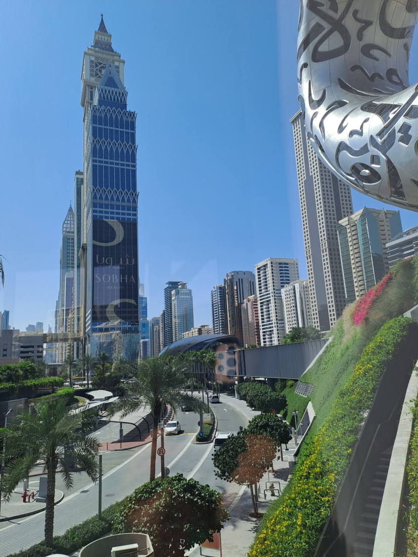 Pa ceļam varēju aplūkot Dubaiju, bet foto ir tikai daži, jo saule spīdēja tieši manas puses metro logā. Ļoti uzkrītoši bija tas, ka šeit metro pasažieri izteiktā parsvarā ir vīrieši, bet ģērbjas ļoti eiropeiski, tikai retais ir tradicionālajā tērpā.